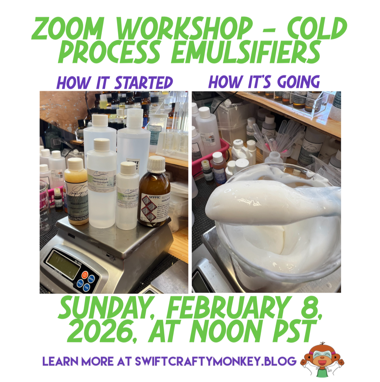 Woo hoo! Our first Zoom workshop of the year! We’ll be playing with cold process emulsifiers making lotions, body butters, cream, and moisturizers. A few might do double duty as hair conditioners as they’re cationic! Please RSVP by posting here or by emailing me at swiftcraftymonkey@swiftcraftymonkey.blog. Right now I have plans to make… 🍃 a...