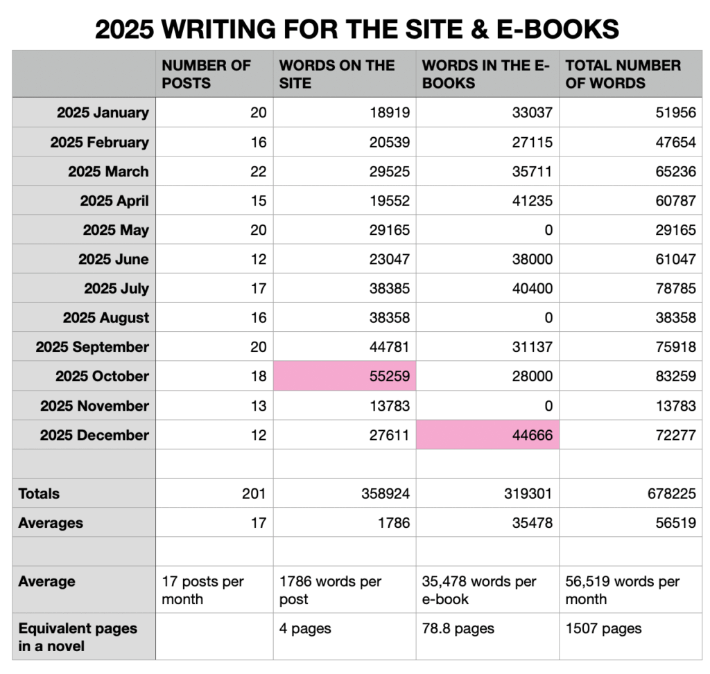 Wow, this year was a super productive and creative year for me. I did the stats – okay, I don’t hate spreadsheets as much as I used to – and I shared 678,225 words between the site and the e-books. If that were a novel, it would be 1507 pages!