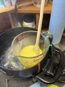 You can add more boiling water to the double boiler if you’re finding the sides of the container are collecting solids. This means your ingredients are cooling and solidifying, and that’s kinda the opposite of everything we’re trying to do here.